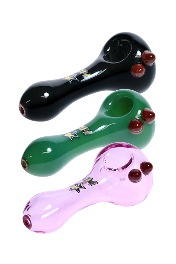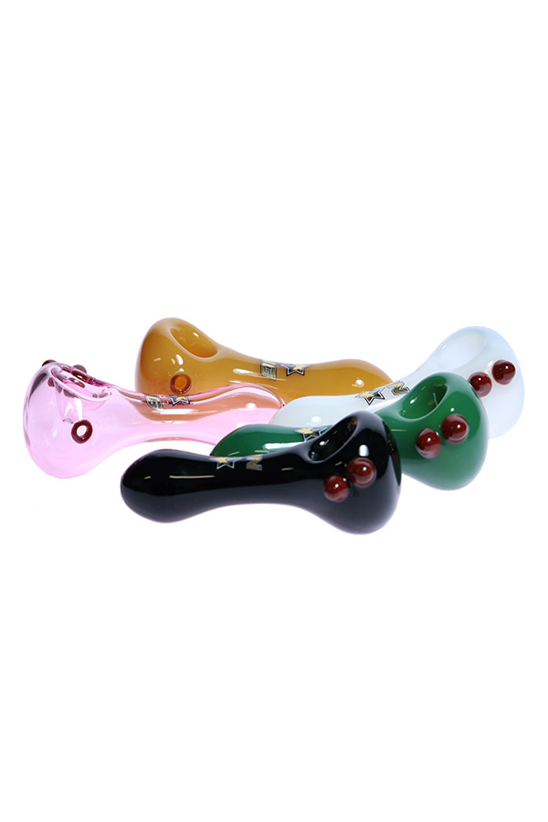 This glass hand pipe comes with double-studded stopper and a slightly levelled bottom making it hard to roll away. It has a deep bowl wrapped in a large spoon chamber that fits comfortably in the hand. Choose from our assortment of colours.
