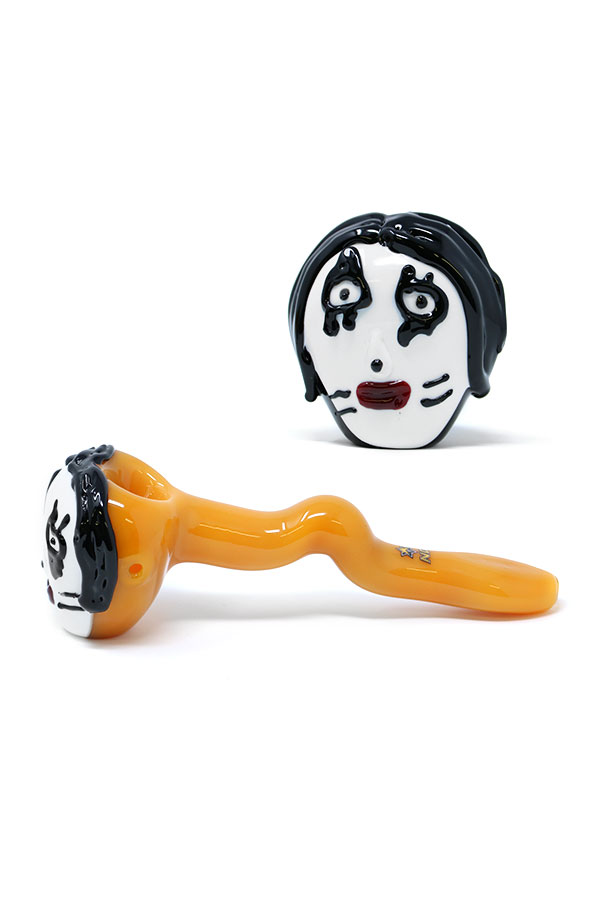 This glass handpipe features a painted face design and comes equipped with a single carb hole in a large chamber housing the deep bowl. The mouthpiece is flat and tube bottom is levelled to prevent rolling. Available in a range of colour options.
