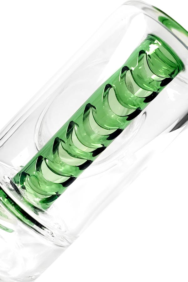 A high end pre-cooler that features an inline percolator with large slits and chamber. It has a 45 degree joint that is suitable for straight or beaker bongs and available in a range of colour options.