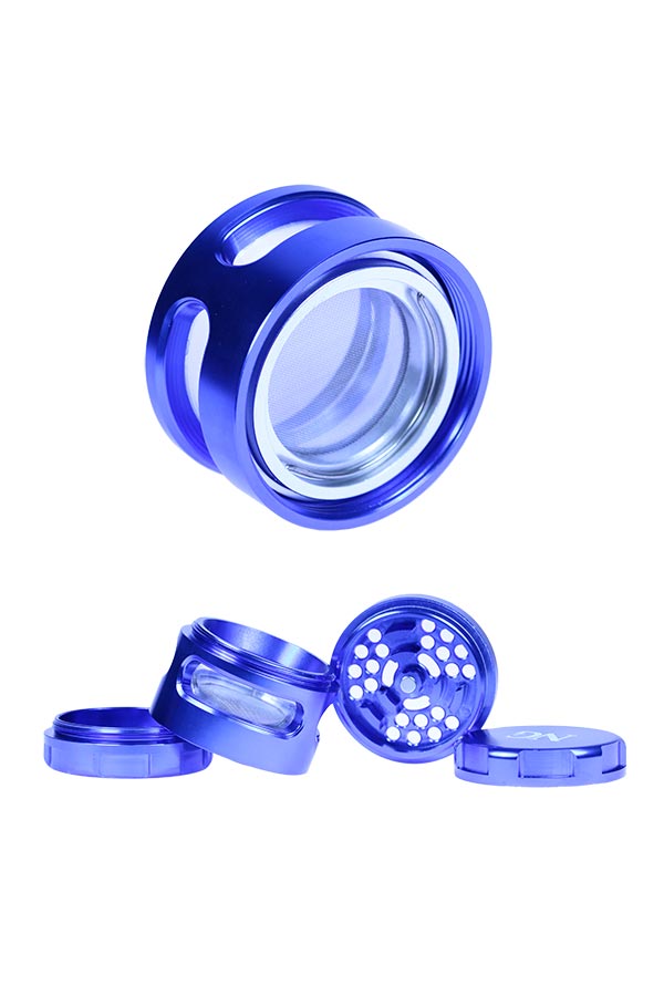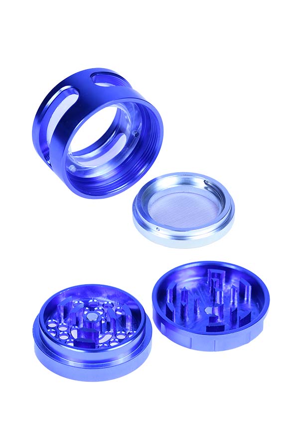 This three side window grinder has a removable screen and is pure CNC-made aluminum. The pollen screen is removable an it comes with a kief compartment and scraper. The ridge designs provides a firm grip when turning the magnetized lid on a nylon friction ring that ensures smooth grinding. There are 11 curved serrated teeth running along a circular patterns that have razor sharp edges.