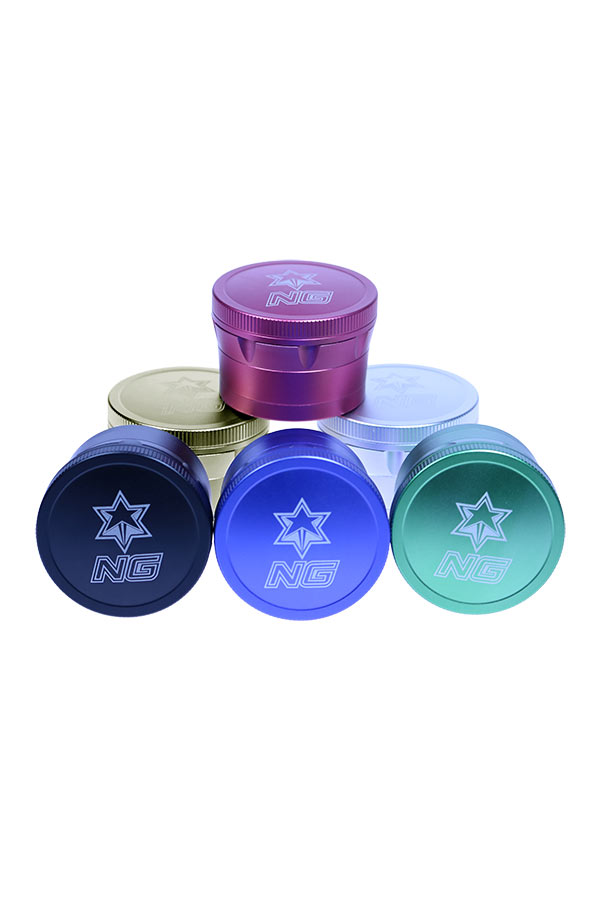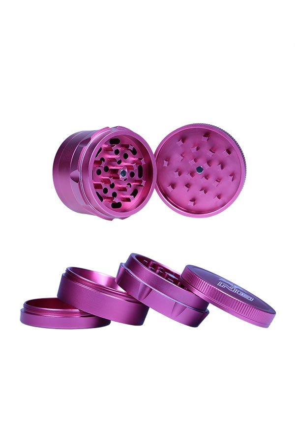 This magnetic-lid grinder is constructed from four pieces of aluminum with a pollen screen and catcher sections. It is equipped with 32 inverted, rectangular serrated edge teeth which tears through your bud with ease. The ridged design provides a firm grip and the nylon friction ring ensures smooth grinding.