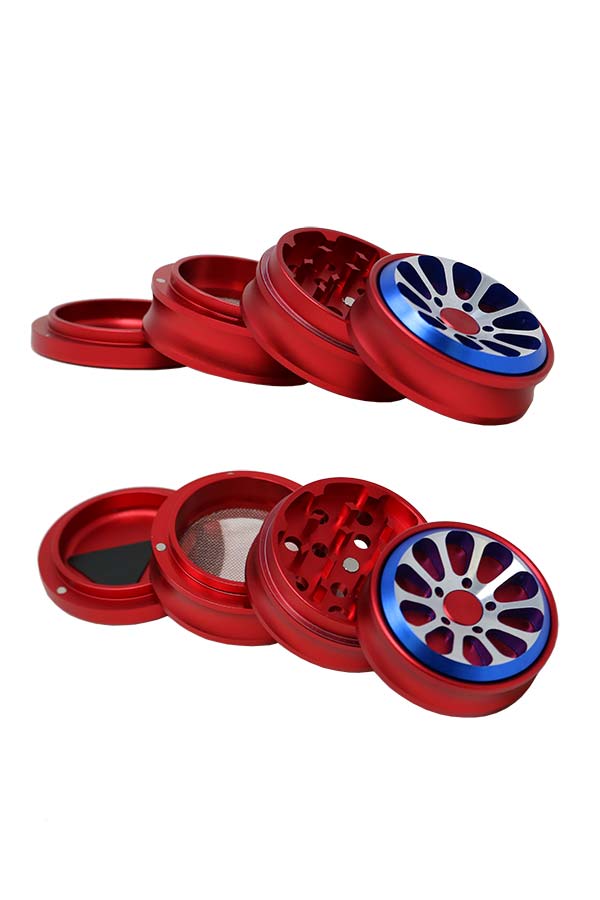 This grinder features a contrasting multi-petal design on the magnetic top lid with a nylon ring that reduces any friction when shredding. The super sharp edges on the 28 diamond-shaped teeth will shred your herbs into fine consistency. It includes pollen screen, catcher section and has a scraper included.