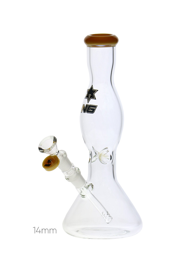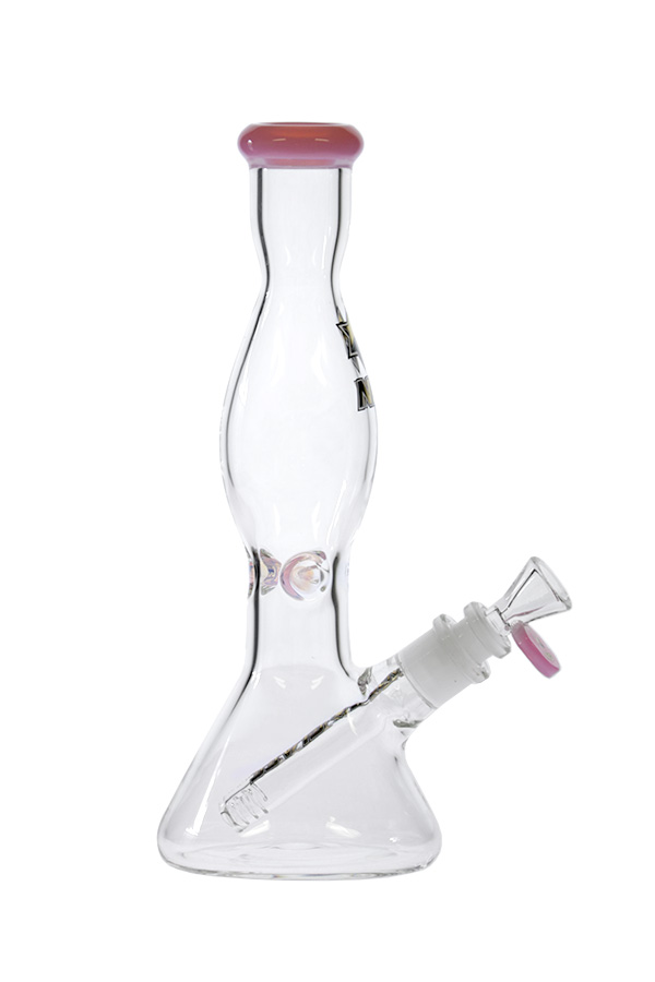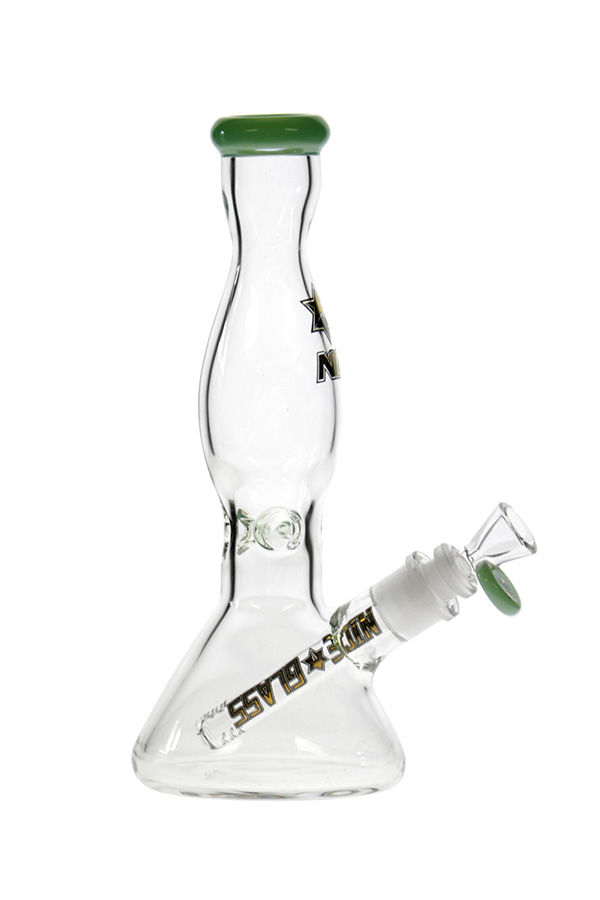 This shapely glass comes equipped with ice notches, slitted diffuser downstem and a cone herb bowl. The mouthpiece and bowl roll stopper are in beautiful solid coloured glass that are available in a range of options. A very stylish beaker with a nice, solid grip.