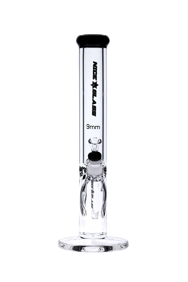 This Nice Glass straight tube bong has a thick base and coloured glass accents. It comes equipped with ice notches, herb bowl, and slitted downstem. High quality borosilicate glass at 9mm thick, it is made to withstand years of use. Available in a range of colours.
