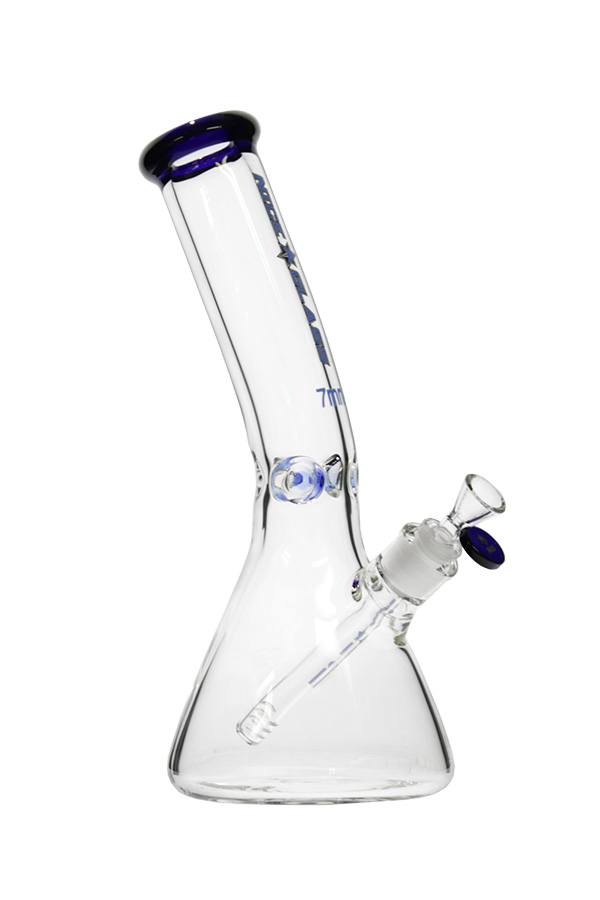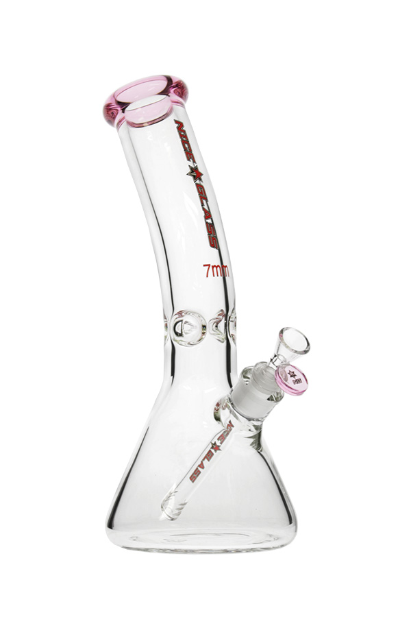 This beaker features a curved neck tube, which is preferred by many for the comfort of use. It comes equipped with ice notches, a herb bowl, and a slitted downstem. We also have a tube version of this Nice Glass water pipe available.
