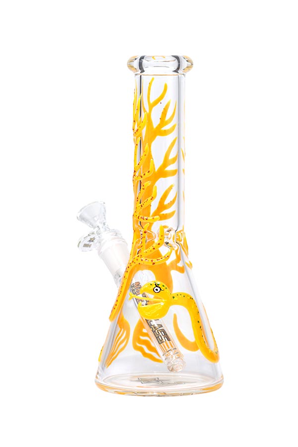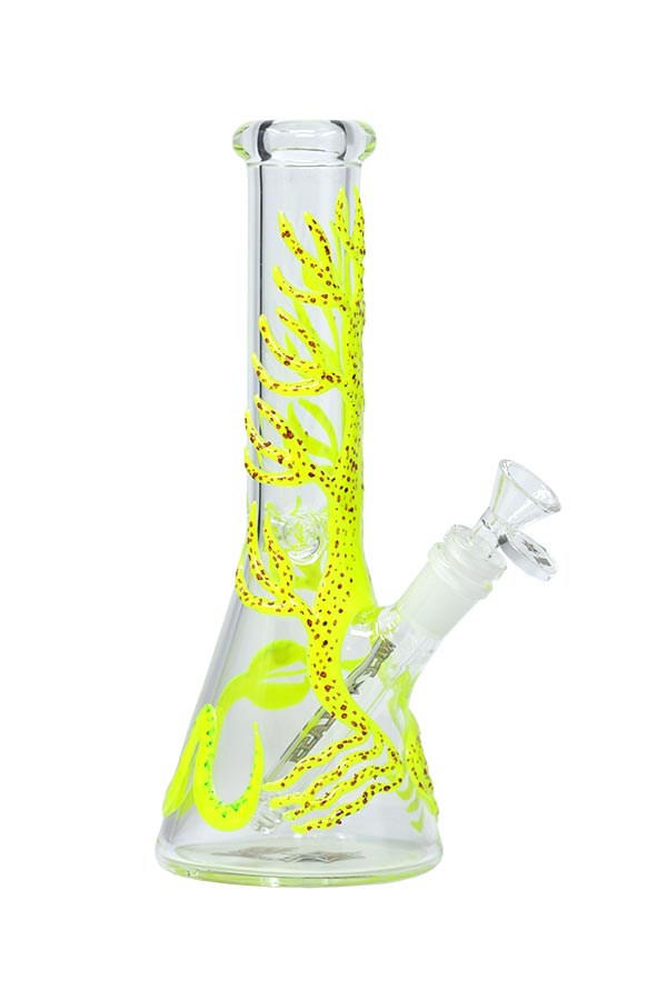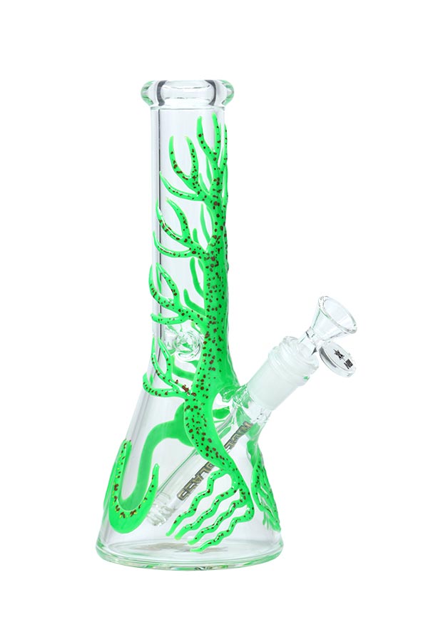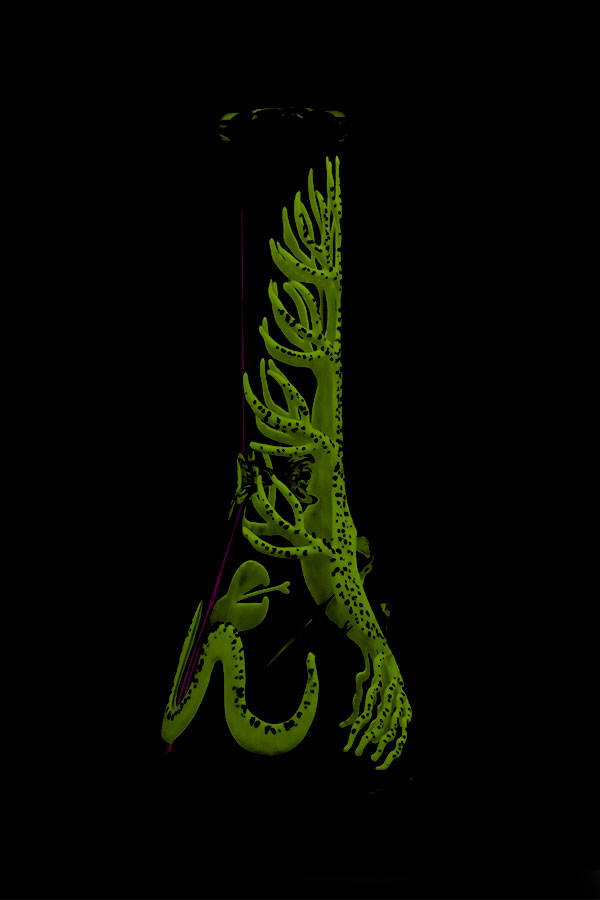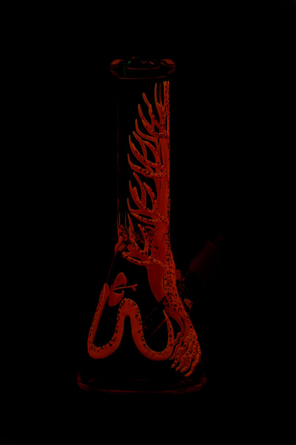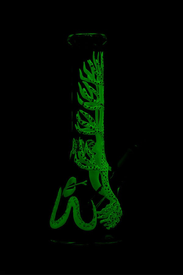 A glow-in-the-dark beaker with serpent and tree graphics that have a raised 3d surface. Comes with a slitted downstem and glass bowl. Small for convenience but still super effective for a nice hit.