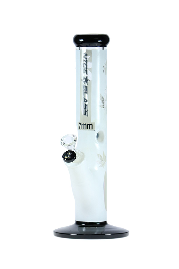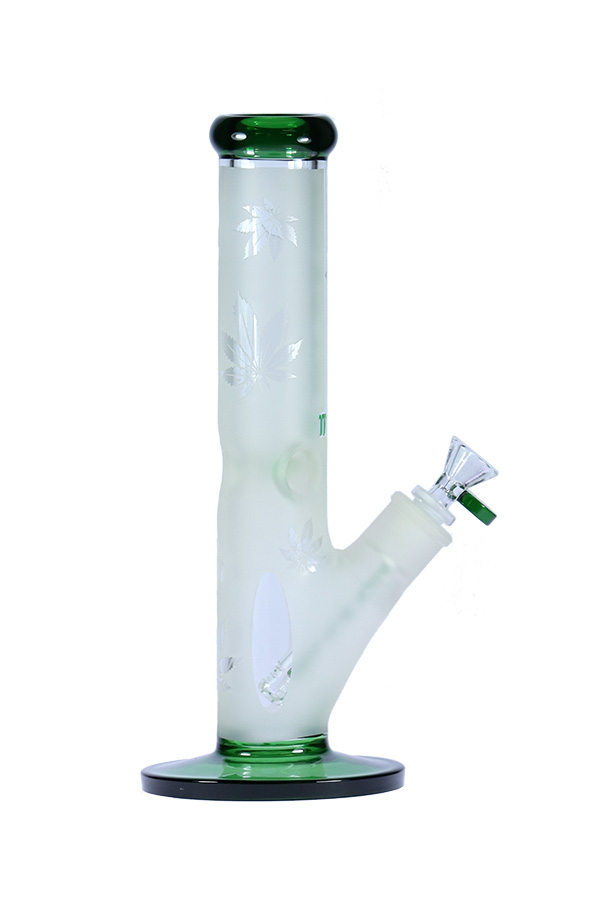 This sandblast design has positive risen leaves throughout the straight tube bong while the negative area is coated with colour. A closer inspection will have you appreciating the details on this bong. It is well-balanced with its sturdy 7mm thickness and elegant look. Comes equipped with a herb bowl and slitted downstem. Coloured glass accent the mouthpiece, base and roll-stopper.