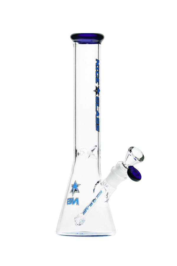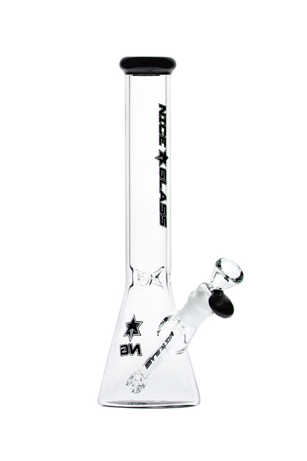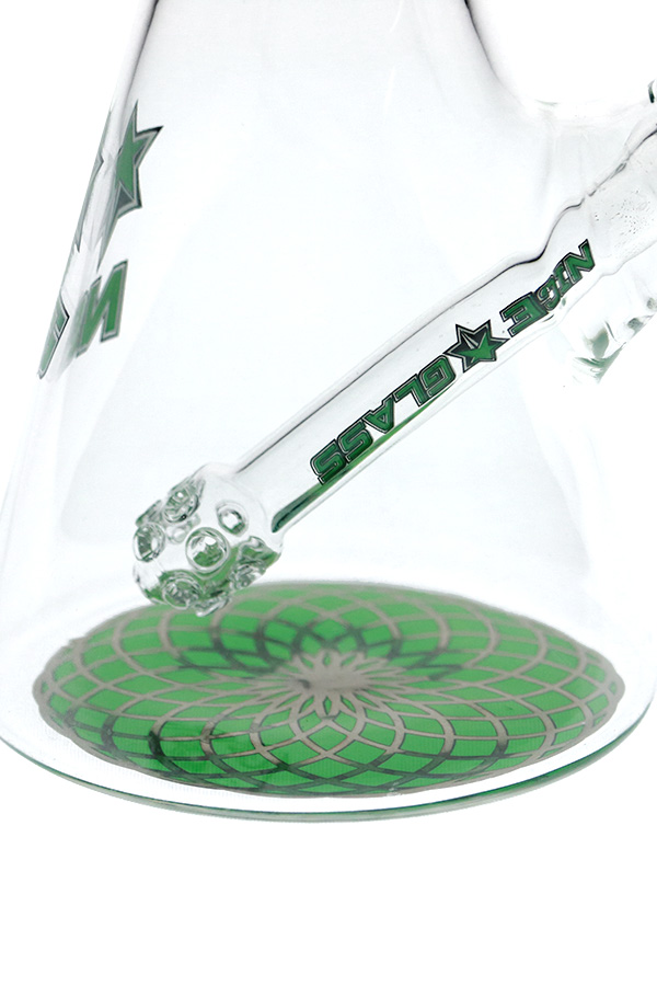 This mini Nice Glass bong is equipped with ice-pinch, herb bowl and a multi-holed diffuser downstem. The beaker base is decorated in a mandala-like decal, giving the beaker design a little touch of flare. The tube provides a nice grip and is lightweight for lounging and enjoying your smooth hit. Available in a range of colours.