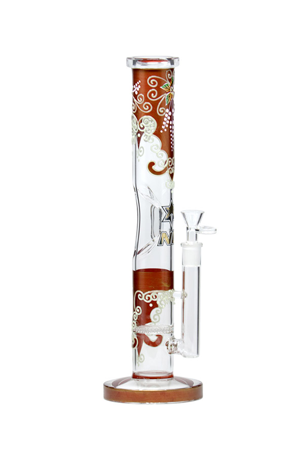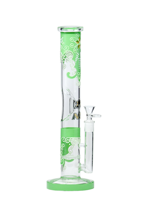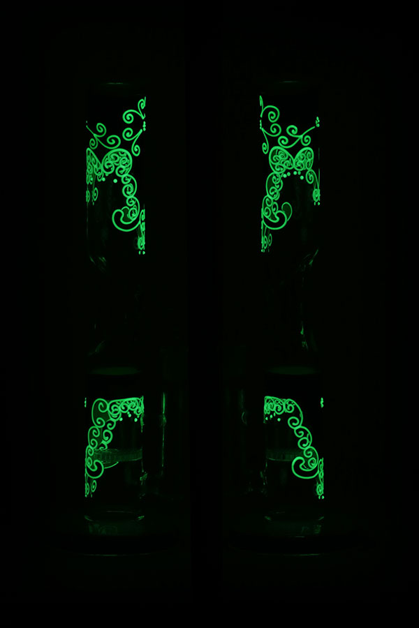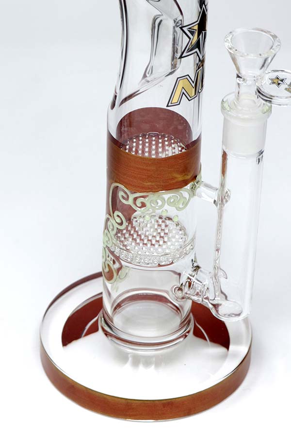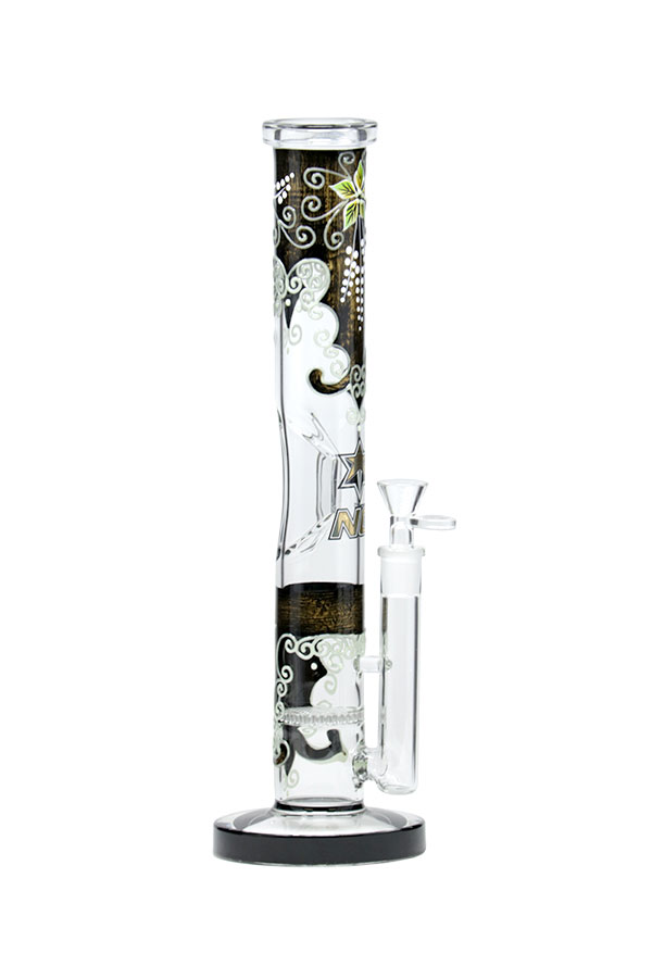 This straight water pipe features double honeycomb disc percolators in a hand-painted tube that glows in the dark. Super functional and beautiful with a large elbow ice pinch to hold a few cubes. It has a fixed stem and comes with a flower bowl.