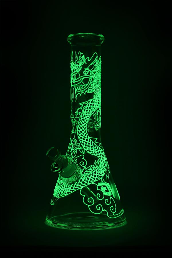 This 7mm thick clear glass bong features glow-in-the-dark dragon wrapping the beaker from top to base. It's a strong and hefty piece that's pretty difficult to knock over. Perfect for those with clumsy friends. It comes with a diffuser downstem, herb bowl and ice notches.