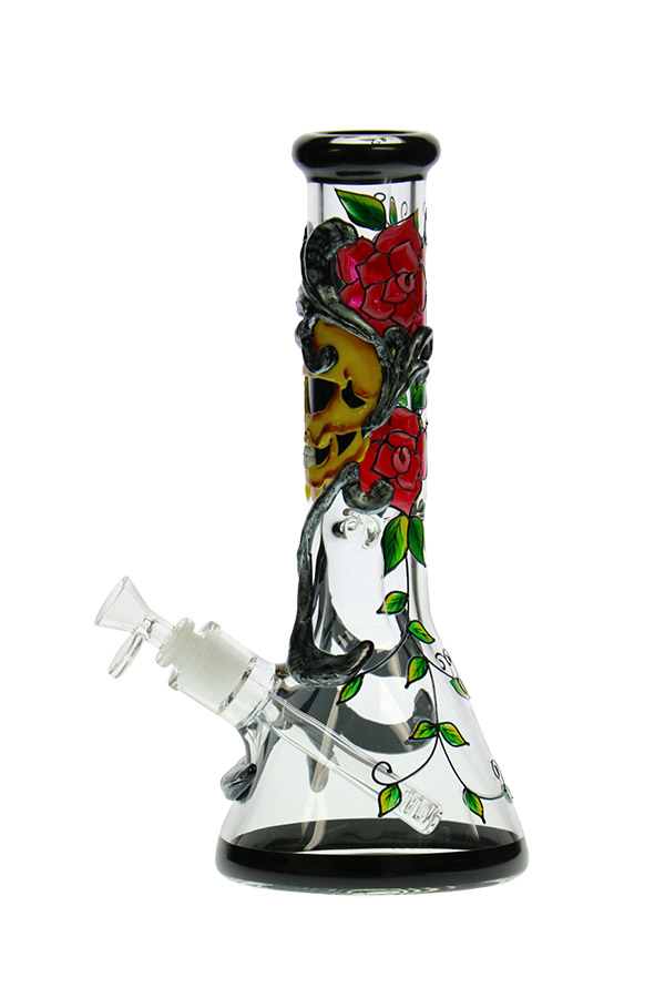This hand-crafted beaker features skull and roses wrapped in beautiful flourishes. The texture adds an extra dimension to the beautiful graphics trimmed with black at the mouthpiece and base. It is 7mm thick and comes equipped with ice notches, diffuser downstem and herb bowl.