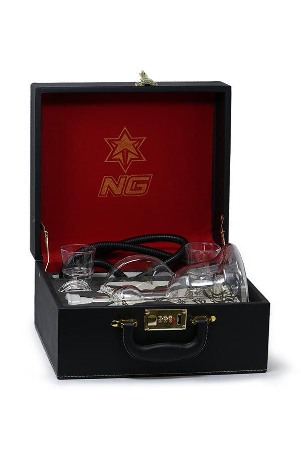This tall clear pyrex glass hookah set includes all the parts you need for an elevated experience. It comes with a base, tray, 2 bowls with different size openings, 2 bowl screens, 5-foot hose, and a hard carry case. The case is strong with a comfortable handle and it is lockable. It is ready to use right out of the box.