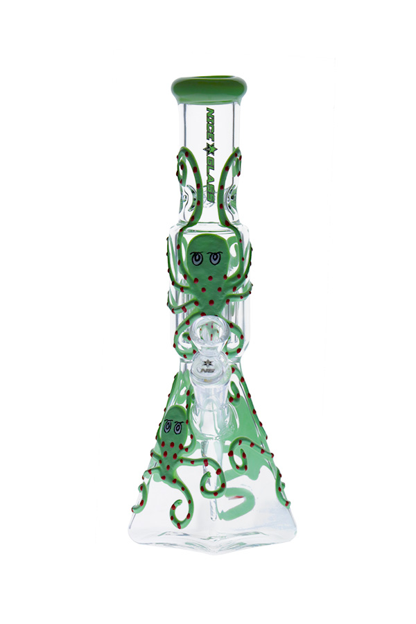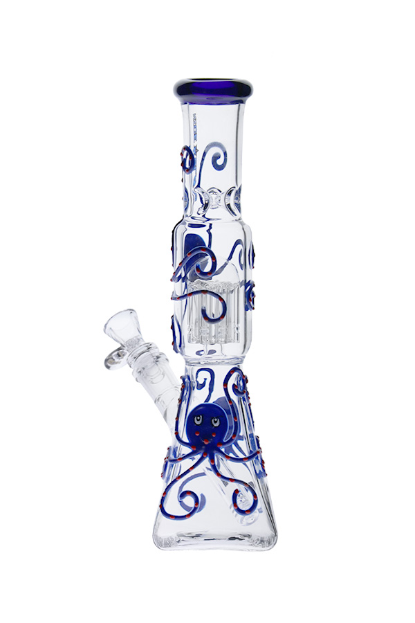 A unique pyramid-base design wrapped in coloured octopuses that comes equipped with ice notches, slitted downstem, honeycomb herb bowl, and an 8-arm tree percolator. The joints are flame-polished, making it smoother for sliding in and out. This specimen comes in a range of colour options.
