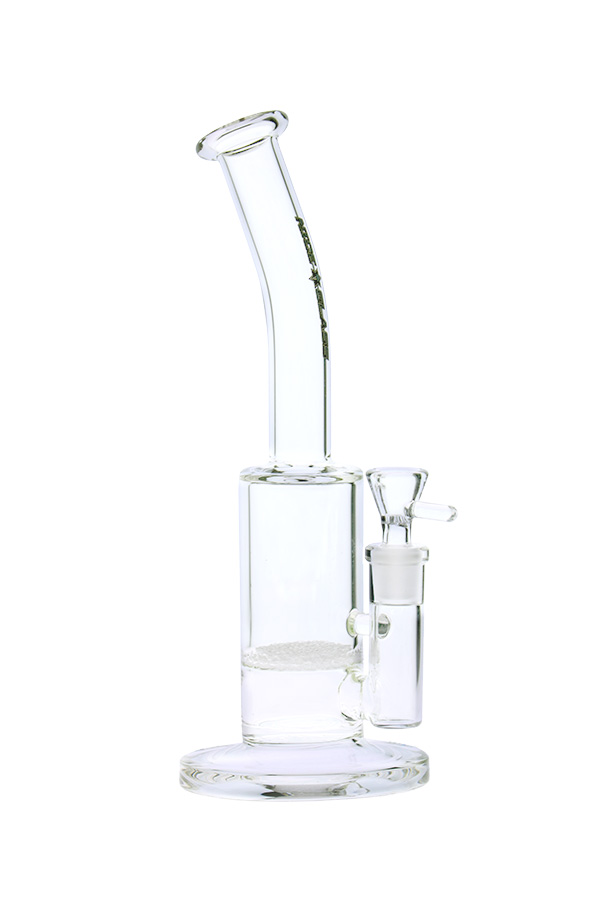 This fixed downstem Nice Glass bong is equipped with a fritted disc percolator dividing the smoke into smaller bubbles, which refines the smoke and cools it down significantly. This results in a silky smooth hit that is packed with flavour. This bubbler is has a comfortable, flared mouthpiece and coloured accents on the flared base, fritted disc and top.