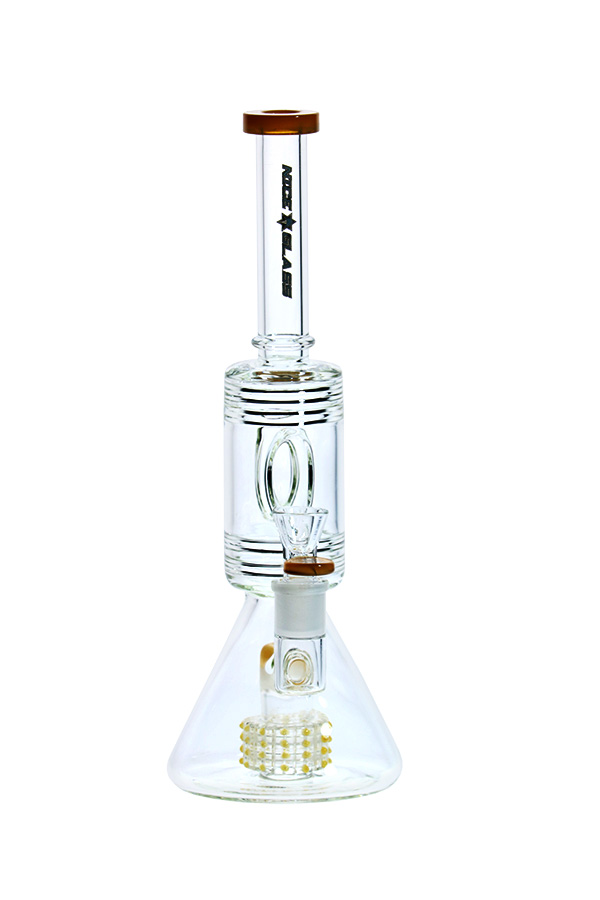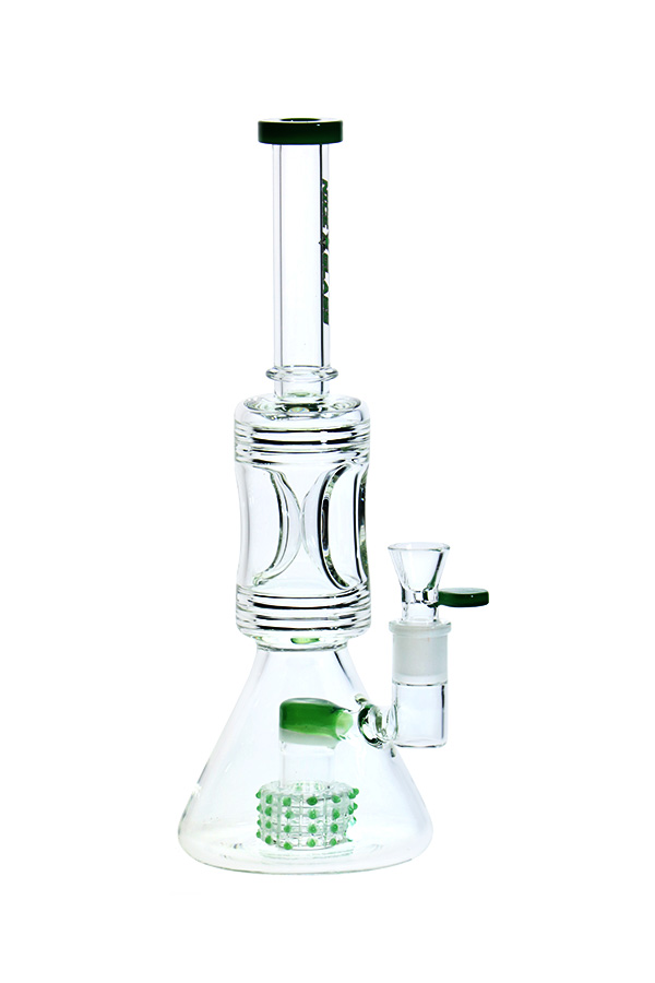 This double elbow beaker is equipped with a matrix percolator which is essentially a cylindrical chamber with vertical and horizontal slits that allows for 360 degree diffusion through the water. It comes with a 19mm joint herb bowl and available in different colour accents.