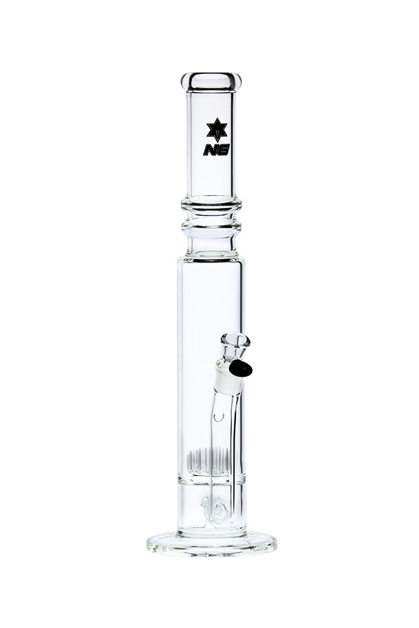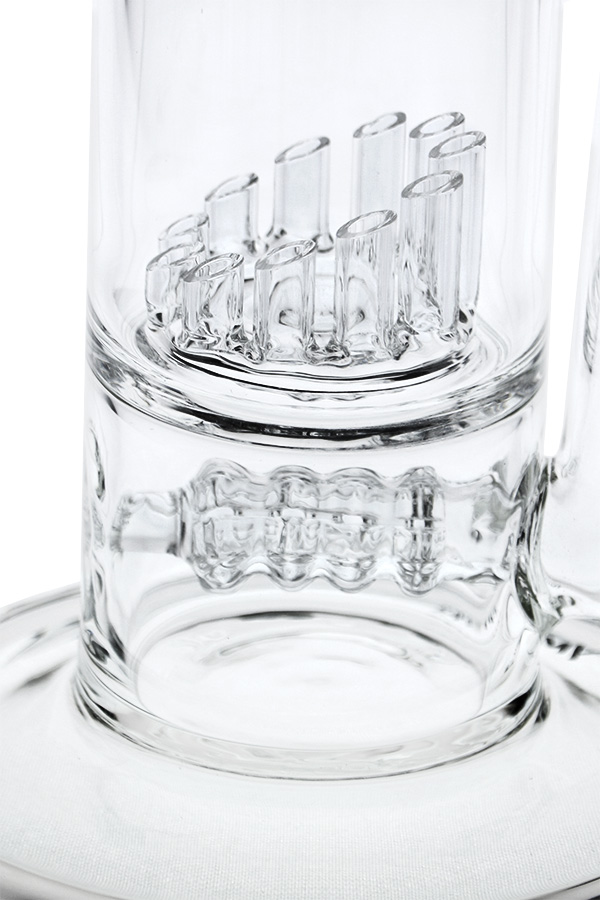 This tall beauty features a roller percolator to a pillar percolator with varied height tubes and comes with a honeycomb herb bowl. The ridged neck piece provides a perfect spot to hold this tall and thick cylinder. Available in clear glass with logo colour options.