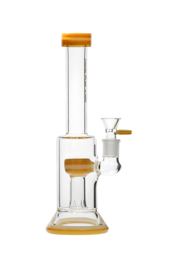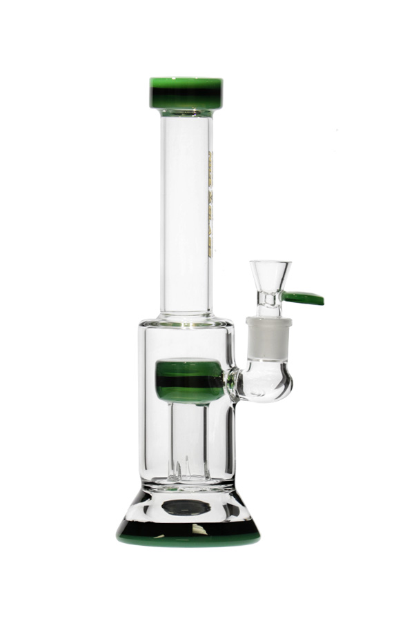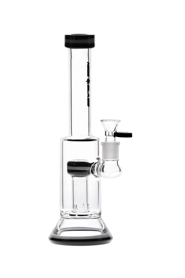 A bong that features the simplest of percolators — a straight perc. Smoke travels from the bowl through the stemless joint into the straight percolator, which is tube with slits at the bottom, and up through the neck and mouthpiece. The black and white dual coloured glass bands around the mouthpiece, percolator top and base gives this glass just enough impact to complement its simple style.