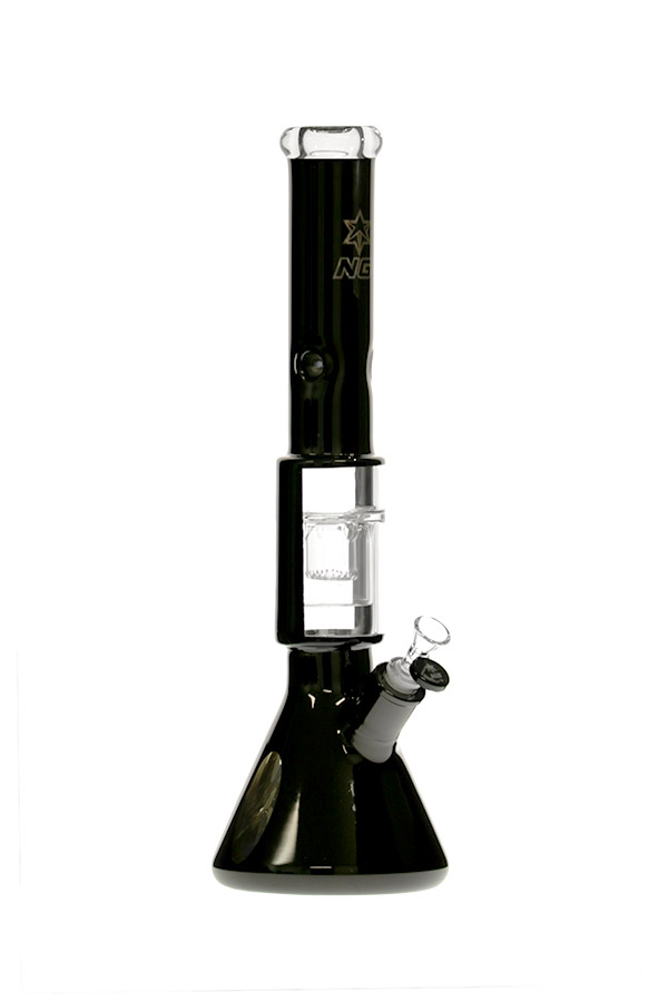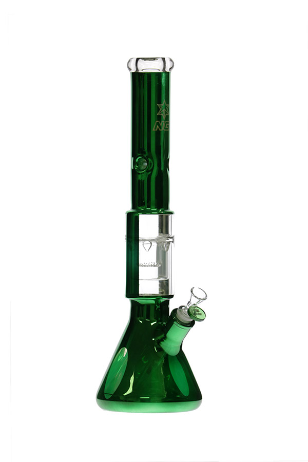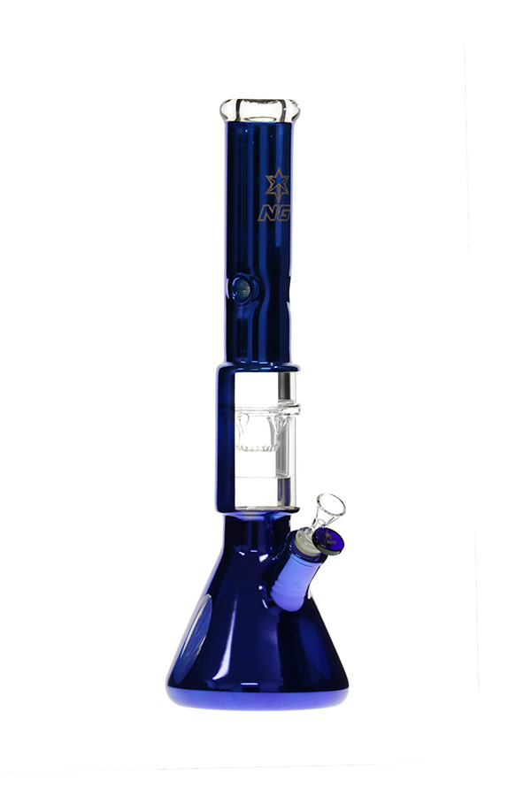 A full metallic beaker with windows to monitor water levels and percolation. The filtering system consists of a cup percolator with vertical slits encircling the bottom perimeter inset inside a larger cup percolator. It comes equipped with ice notches, herb bowl, and a slitted diffuser downstem. The shine and vibrancy of the metallic makes this a great show piece for your collection.