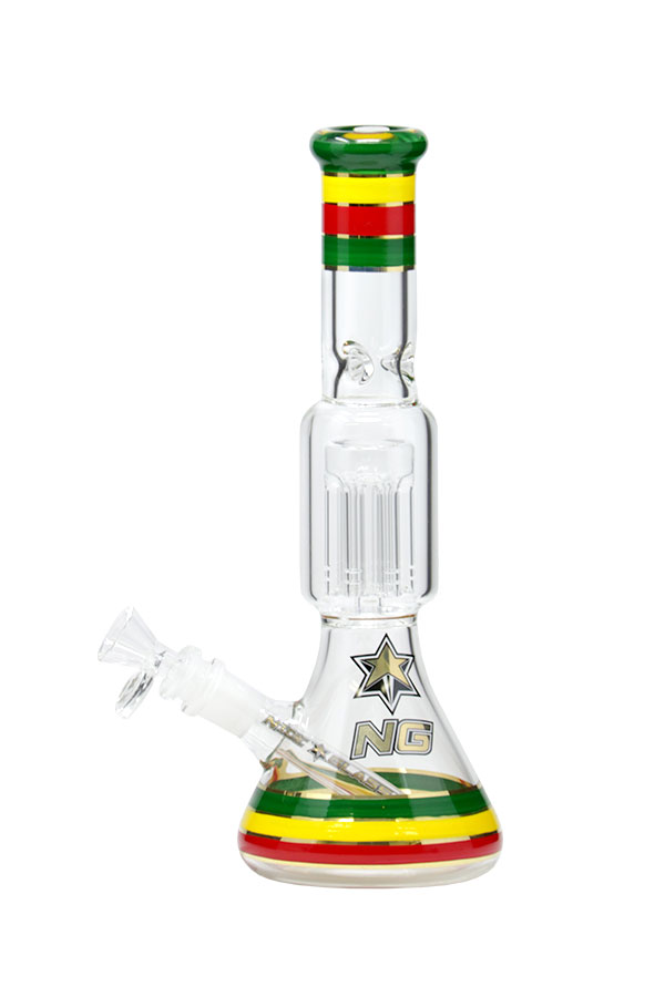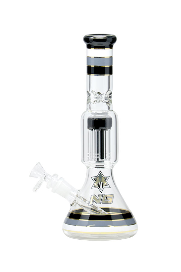 This bong features an 8-arm tree percolator encased in a 5mm thick can. The colors are hand-painted and have gold band accents. Get all the filtration and smoothness you need with a diffuser stem to tree perc and a couple of cubes over the ice pinch. Comes with a flower bowl.