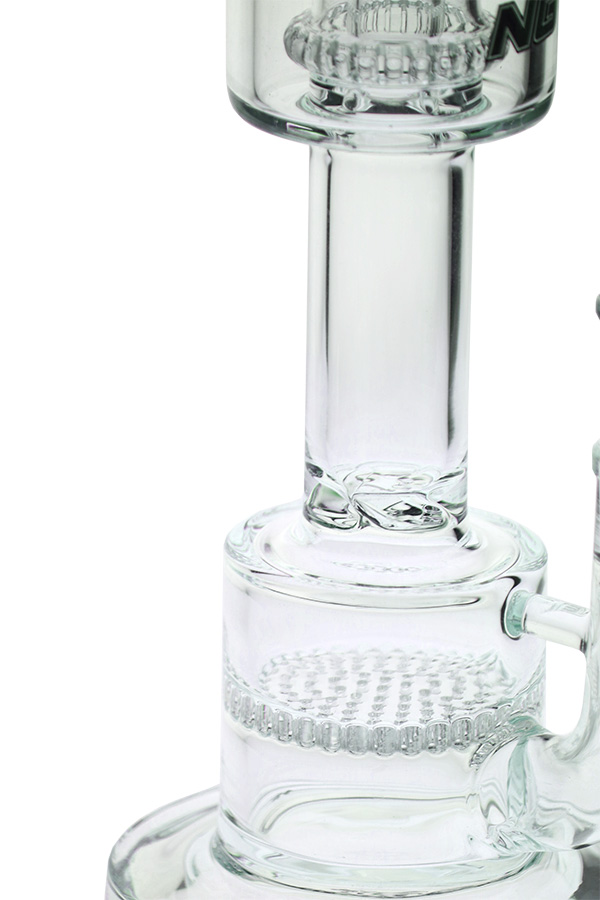 This dumbbell-shaped Nice Glass has all the percolators with a mid section that is just perfect for gripping. The vapour goes through three stages of diffusion before exiting the angled mouthpiece. It starts out at a large disc percolator before reaching the cyclone disc and funnelled to the finely-cut cup percolator. It is not only effective in giving you a smooth hit, but also has a fun factor added seeing all the action. It comes equipped with a honeycomb herb bowl with roll stopper.