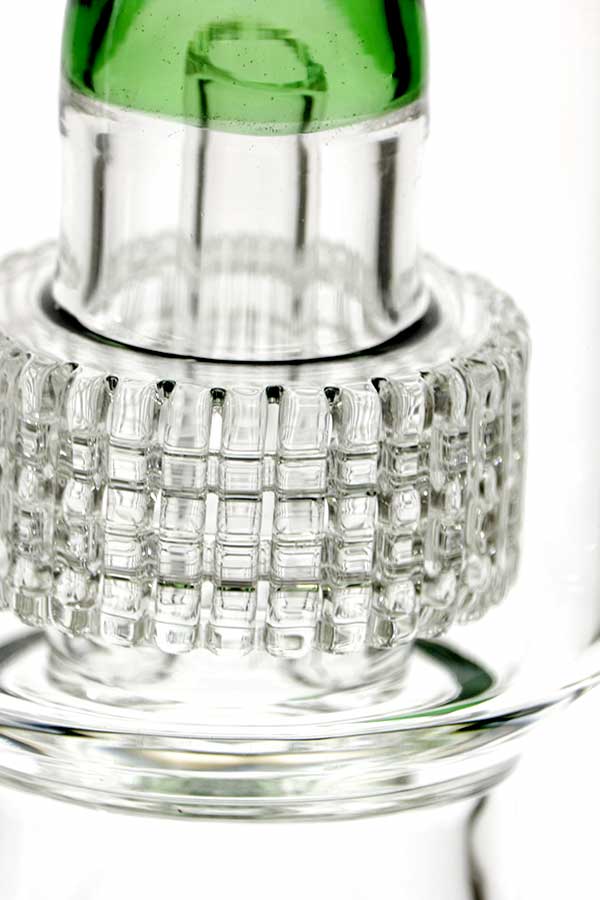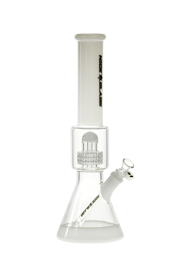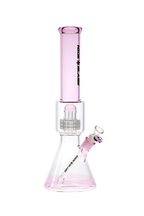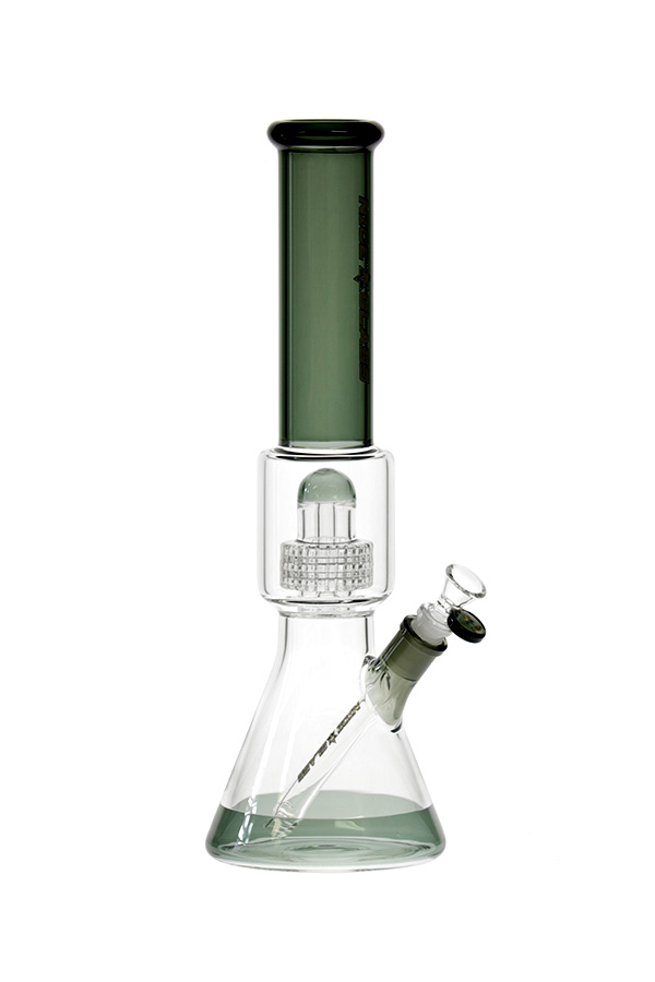 This beaker features a large stereo matrix percolator in the upper chamber fully diffusing the smoke before entering the neck tube through a concentrated hole. This combination provides cool smoke with a smooth taste. It also comes equipped with a slitted downstem and herb bowl. The neck and accent colours are available in different options.