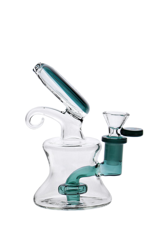 A unique mini bubbler with a tire percolator and a flat air chamber which also houses the mouthpiece opening. Embellish with coloured glass and a swirl stem which also doubles as a non-slip feature. Available in a range of colour options.