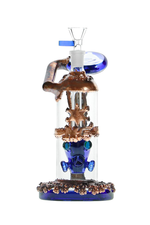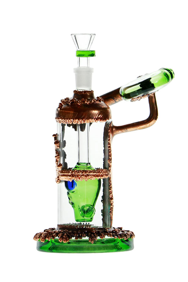 This NG glass is coolness amplified with a gas mask percolator encased in a glass covered in copper plating. Our Nice Glass logo is also incorporated into the electroplating application, giving it a cohesive finished look. The mouthpiece is a disc-shaped chamber with a small opening, that will give you a very effective hit. Choose the accent colour you like and enjoy.