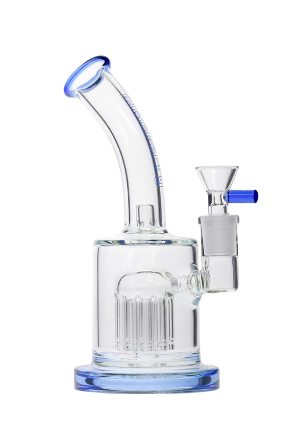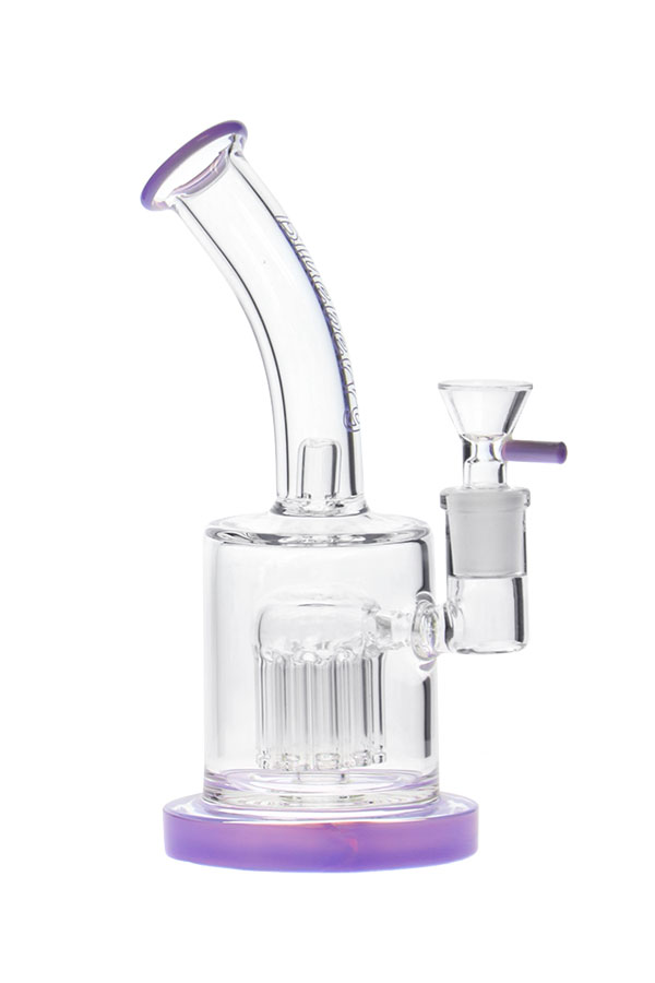This cute bubbler features a tree percolator with 10 arms and a splash guard at the base of the tube to prevent water from exiting the mouthpiece. Although it is a small handy little piece, it is packed full of filtration. Watch all the aeration take place to give you a toke smooth as a baby's bottom. It is equipped with a narrow handle flower bowl.