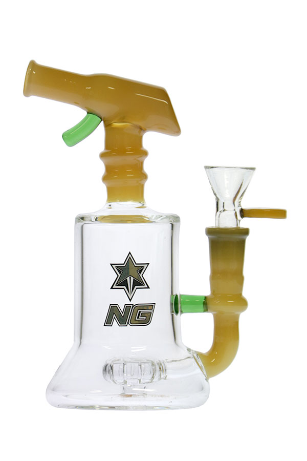 This fun bubbler features a torch gun mouthpiece design and a circ perc. The expanded base bottom compensates for the narrow chamber allowing more water volume for a small bubbler. It comes with a herb bowl color handle which also matches the mouthpiece and direct-inject down stem.