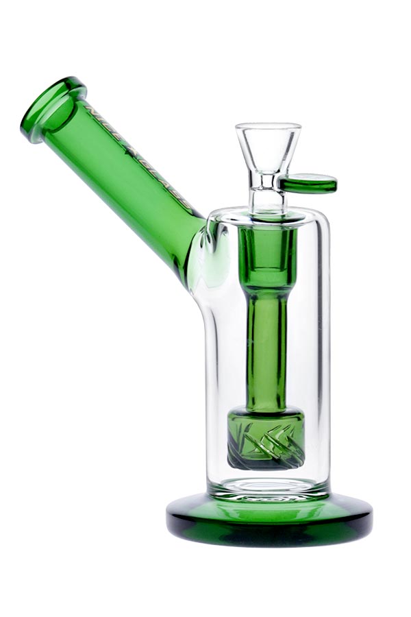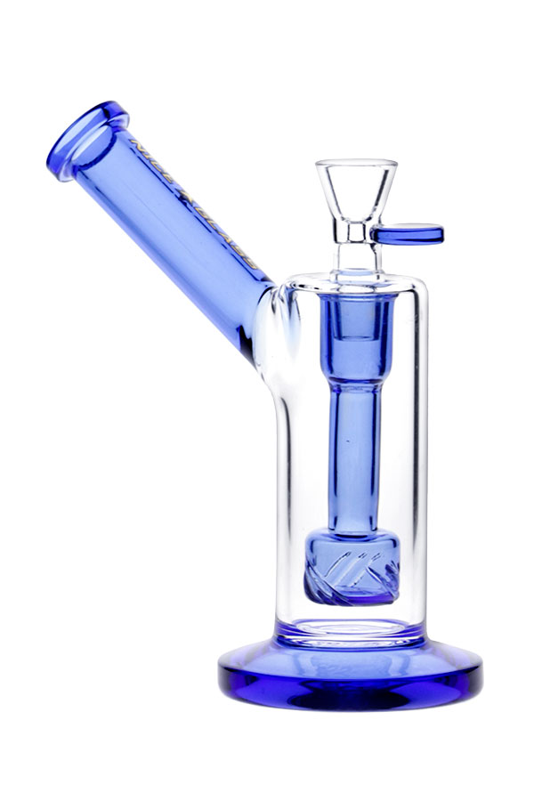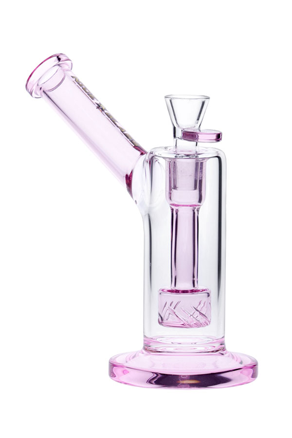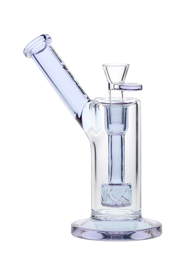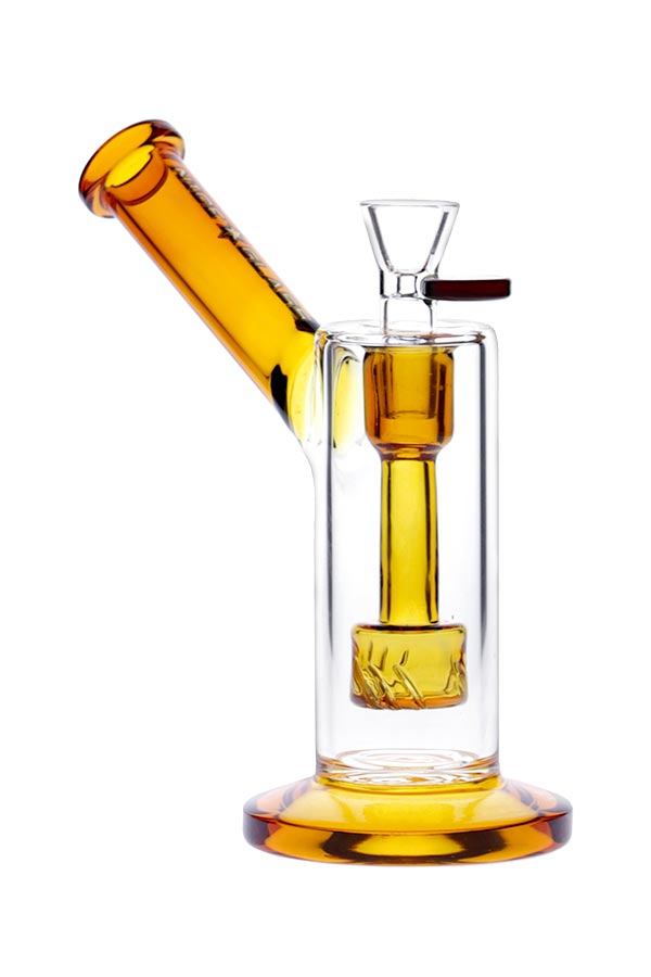 This cylindrical bubbler holds a gridded drum percolator and features an angled neck and a flame-polished joint herb bowl that sits atop of the chamber. Clear glass with coloured accents that are available in many options.