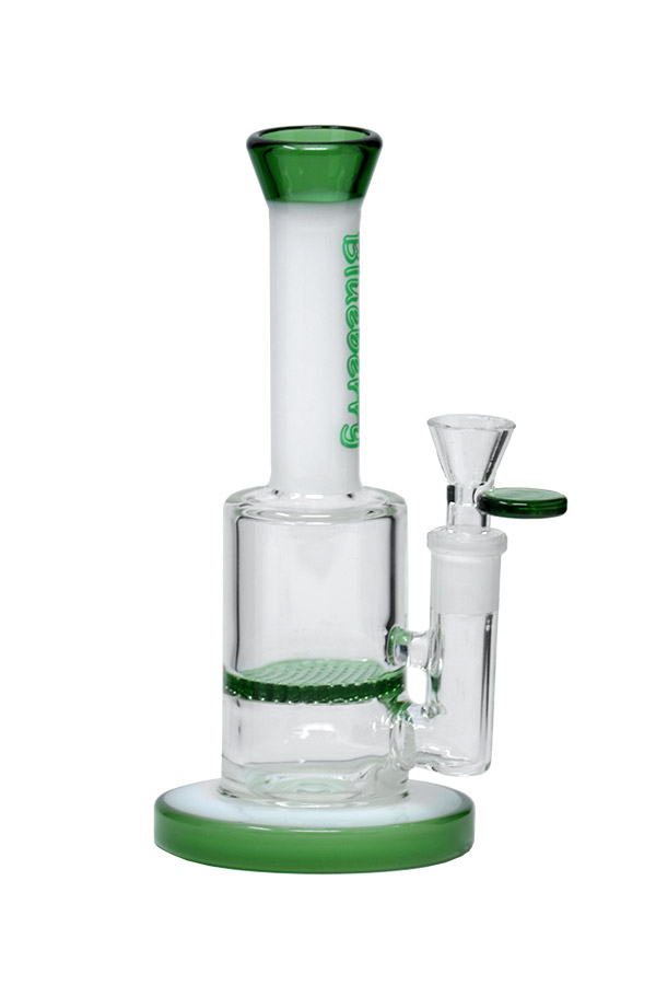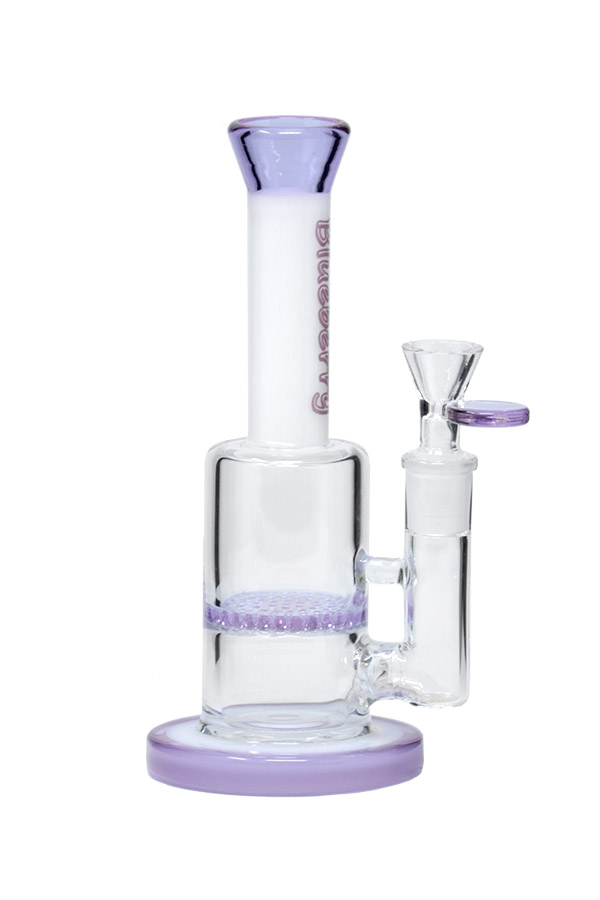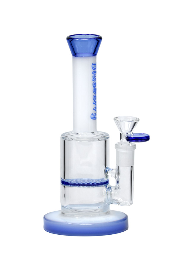This is a cute Blueberry bubbler featuring a honeycomb disc percolator. The neck and base are solid glass with colored accents. It has a reinforced downstem and comes with a flower bowl. If you're in the market for a perfect little bubbler with lots of filtration action, this is the one.