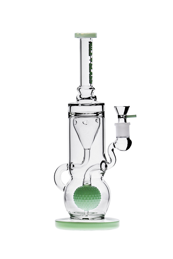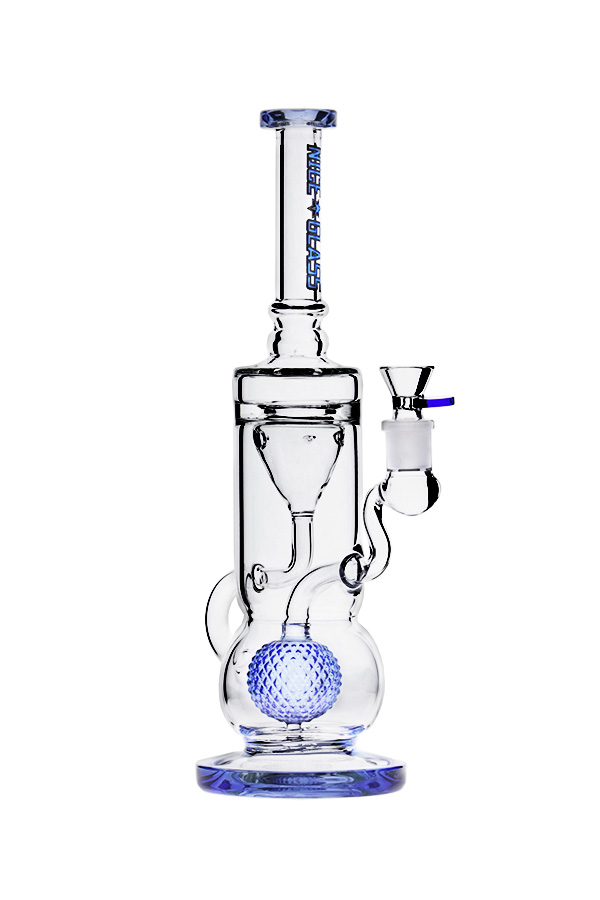 This is one of our tallest Nice Glass incyclers featuring a stunning textured ball percolator housed in a round base. Multiple aeration holes encircle the lower part of the ball, pushing the vapor down into the cool water. The neck is slimmer to create a smooth and intense experience.