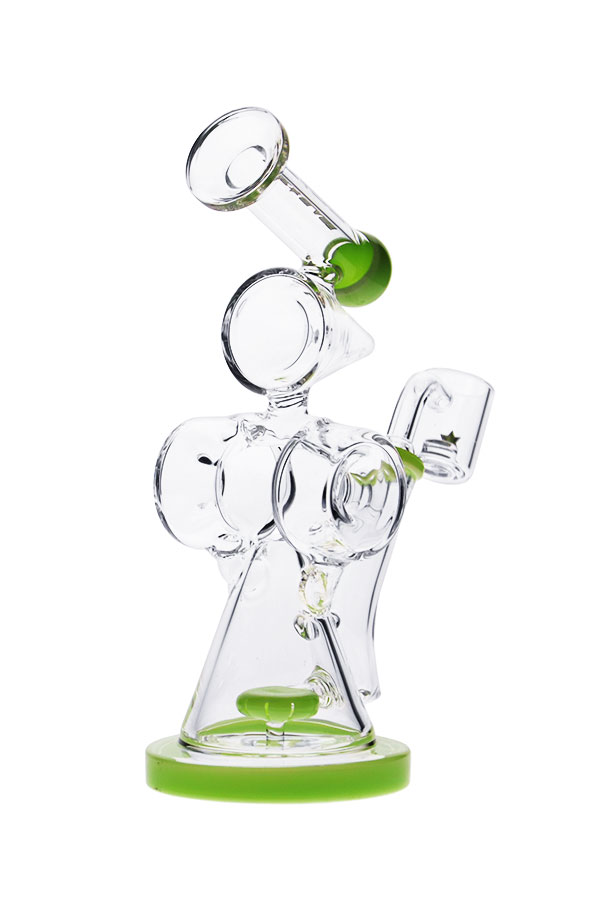 This rig features two donut chambers and a cone chamber creating an indirect pathway and more surface area to cool down the vapour. It has a percolator with vertical slits encircling a puck shape and comes with a core reactor quartz banger. The thick quartz inside the center of the bucket will retain heat much longer than most bangers and can also handle larger dabs with lower temps. Available in a range of colour options.