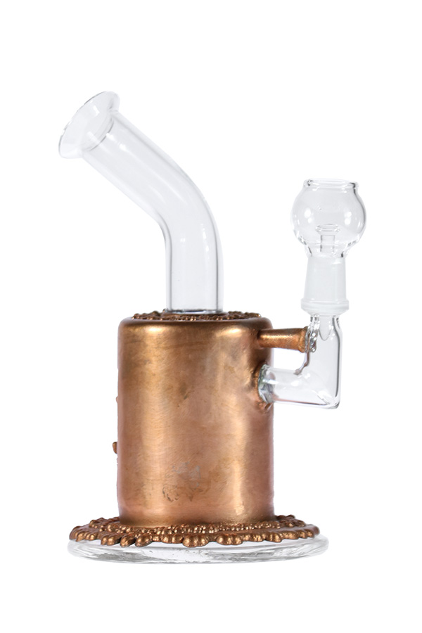 This electroplated oil rig comes equipped with double wheel-shaped percolator and a quartz nail and dome. The neck is curved with a flared mouthpiece. A small window in the body allows for the monitoring of the water levels and clarity; from the other side, it appears as as solid copper cylinder. Our NG logo is also incorporated in the electroplating process.