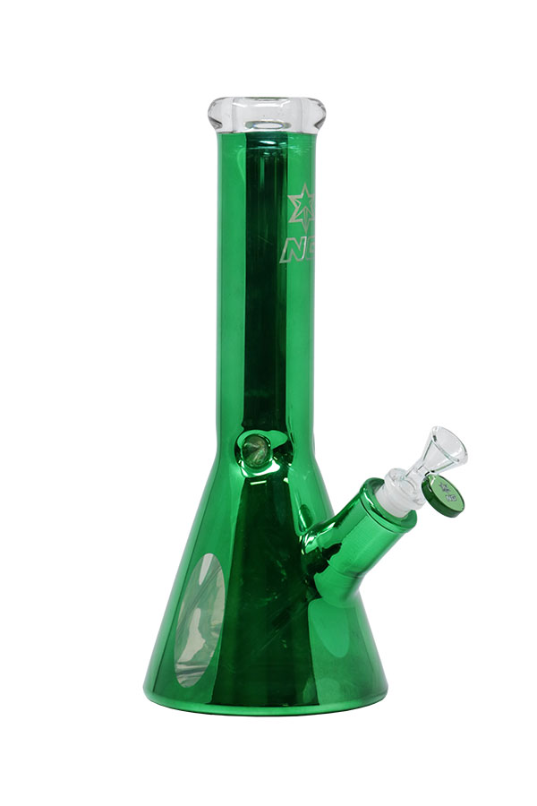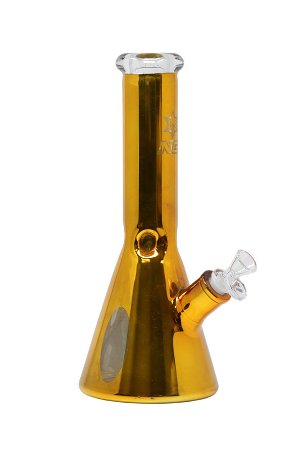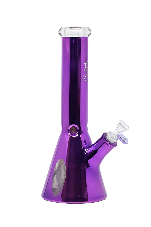 This beautiful 7mm thick beaker is wrapped in semi-transparent metallic with a clear window close to the beaker base to see the filtration in action. The mouthpiece is solid black glass and it comes with a slitted downstem, herb bowl and ice notches placed in just the right position allowing for several cubes to be inserted. It is a very sturdy classic piece with significant weight to it. Available in a range of colour options.