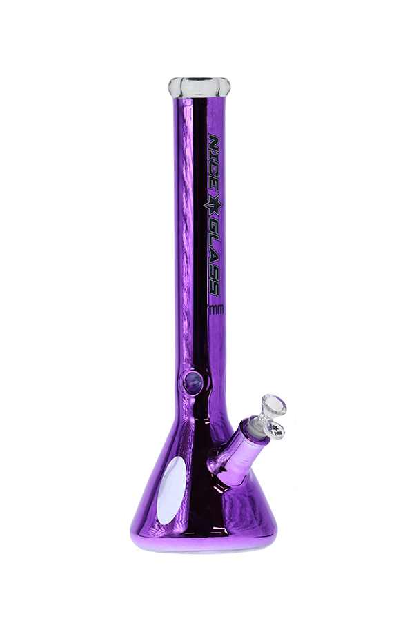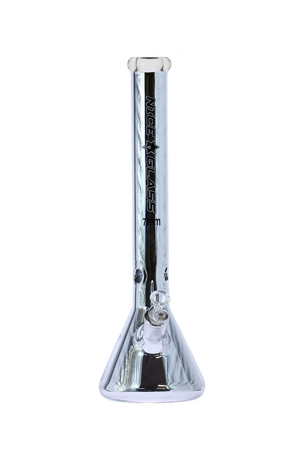 It's your time to shine! Just take a look at the finish on this Nice Glass. 100% borosilicate glass coated in a polished metal finish. This 18-inch beaker is equipped with ice notches, a herb bowl, and a slitted downstem. This one rips hard and is made to last. We also have the straight tube equivalent available.
