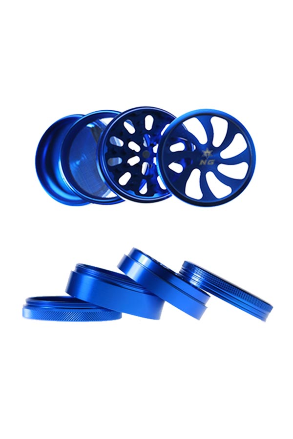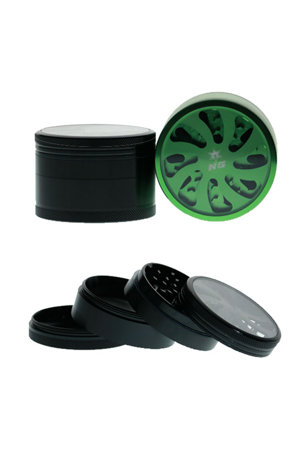 This aluminum grinder features petal-like window design on the top and has 50 razor sharp diamond shaped teeth. It has a magnetized lid, pollen screen and pollen catcher with scraper. The nylon friction ring ensures smooth grinding when turning the lid.